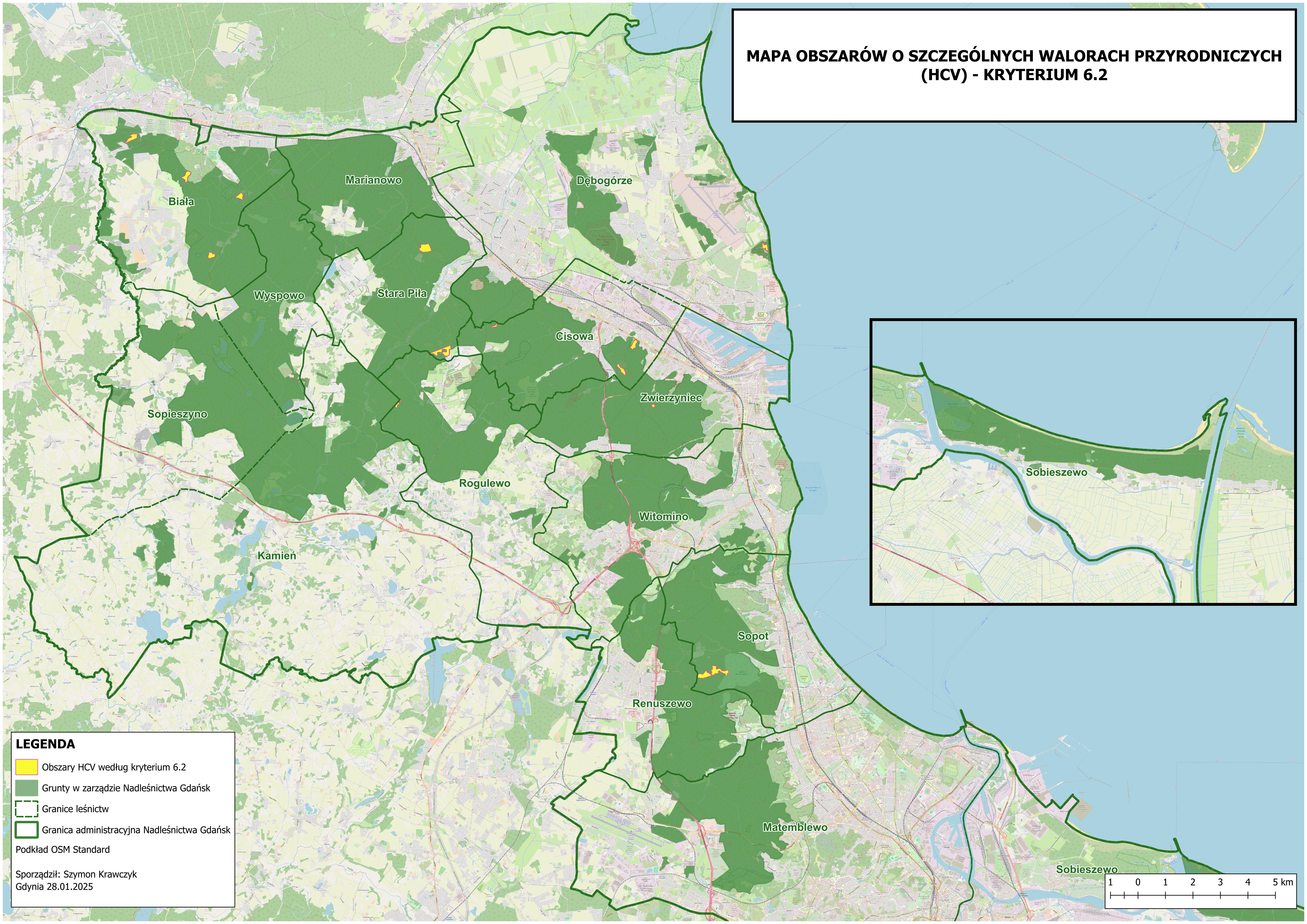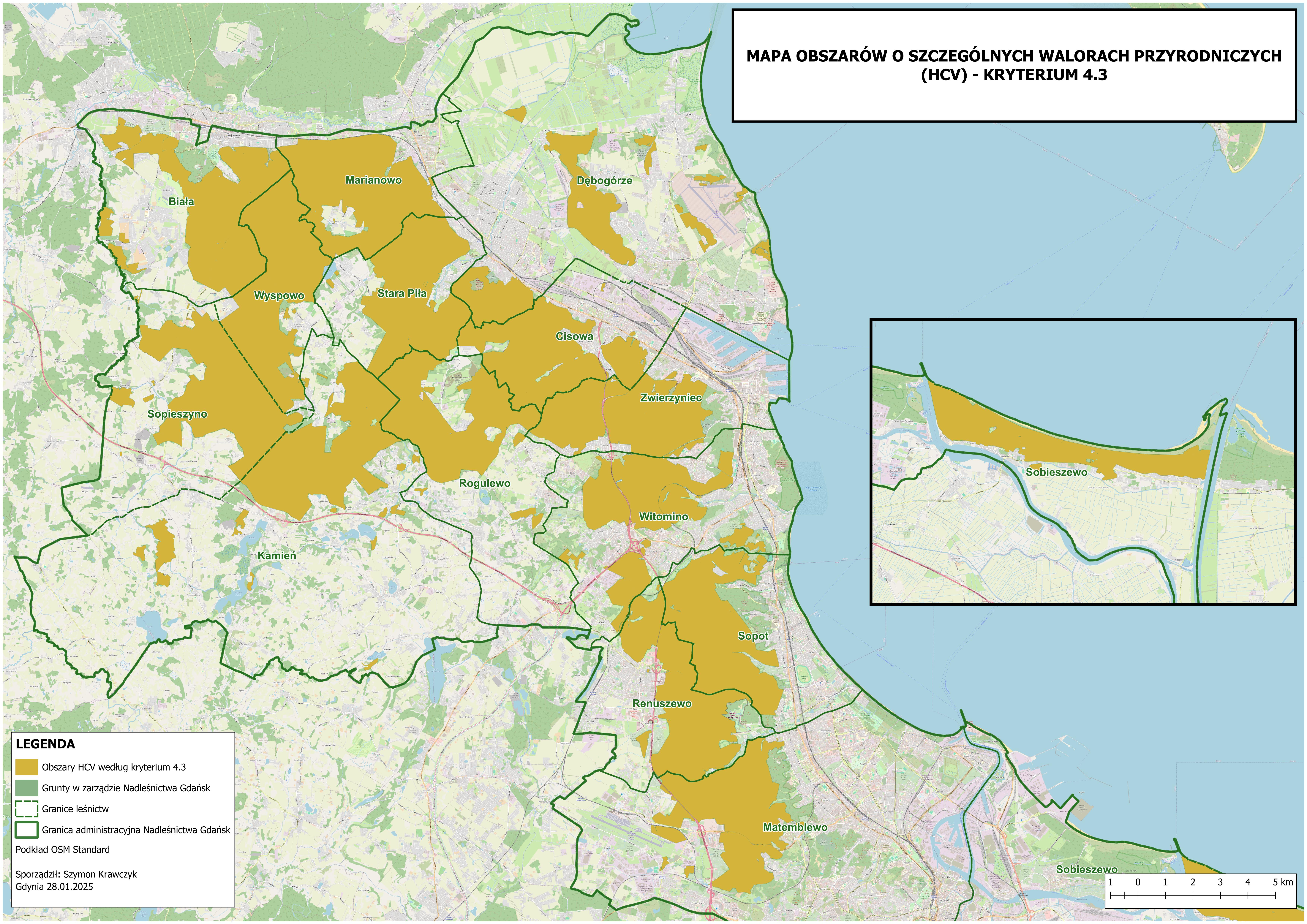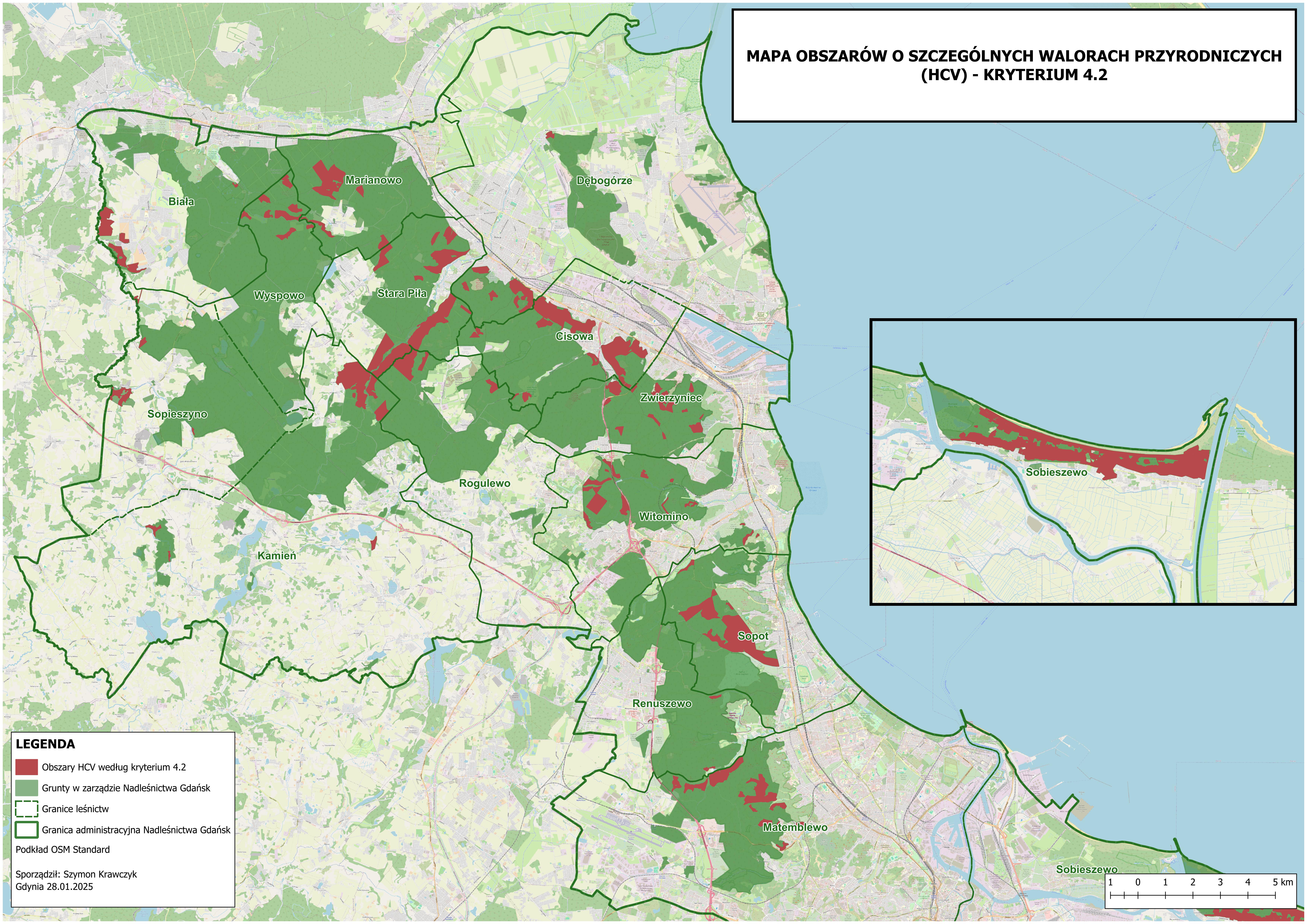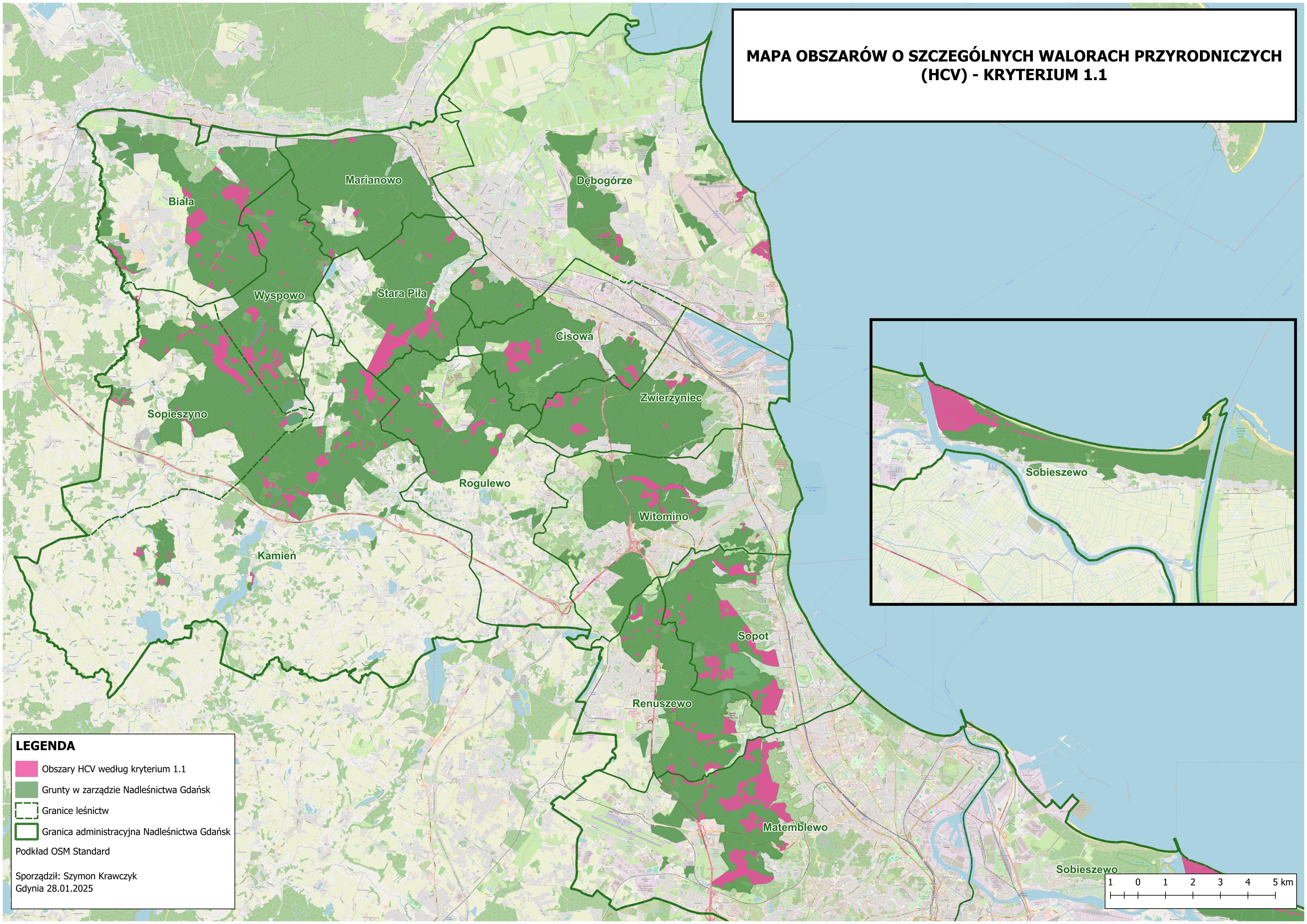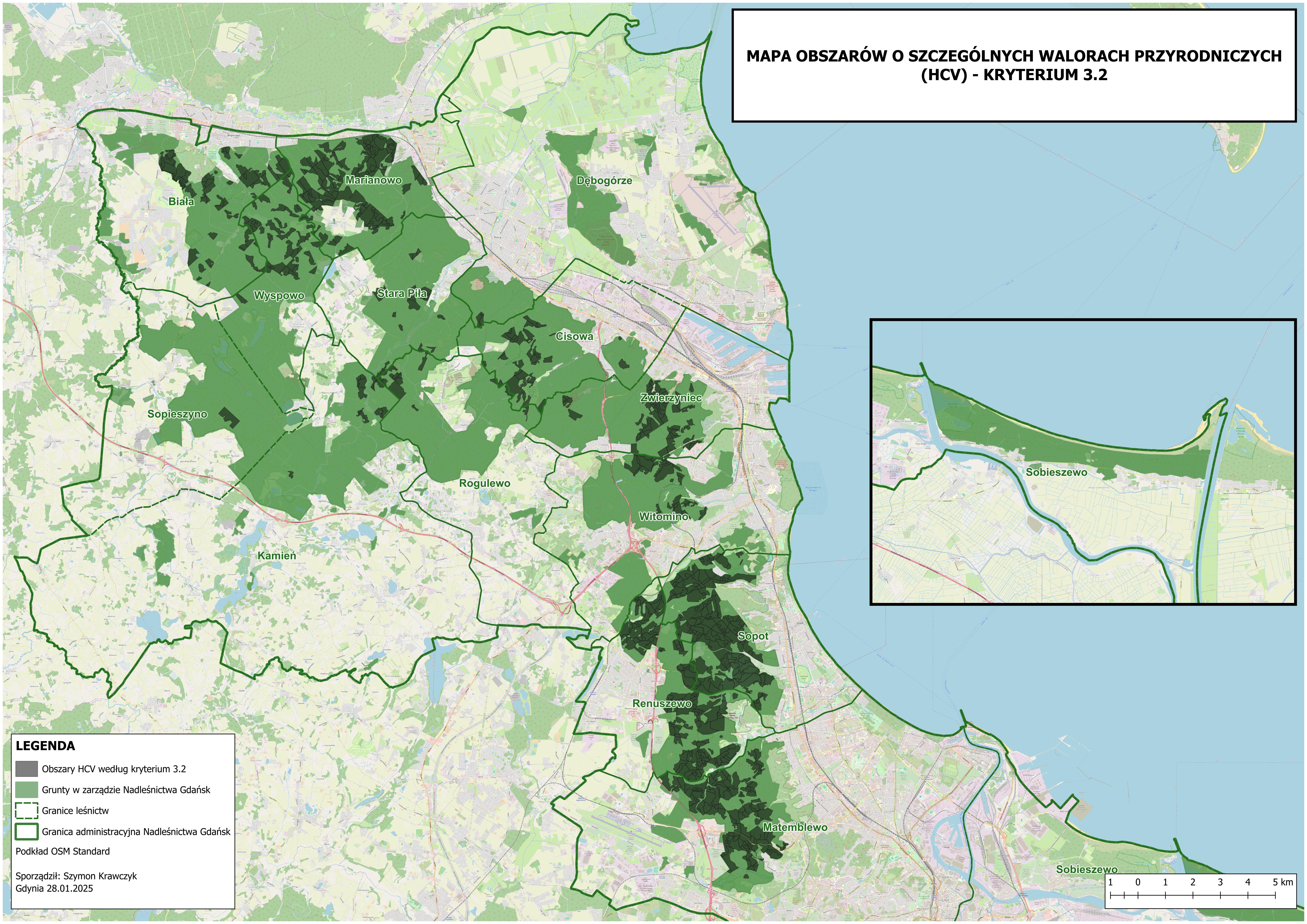Zgodnie z Przejściowym Standardem Odpowiedzialnej Gospodarki Leśnej FSC dla Polski (FSC-STD-POL-02-2024) Nadleśnictwo Gdańsk wyznaczyło obszary HCV.